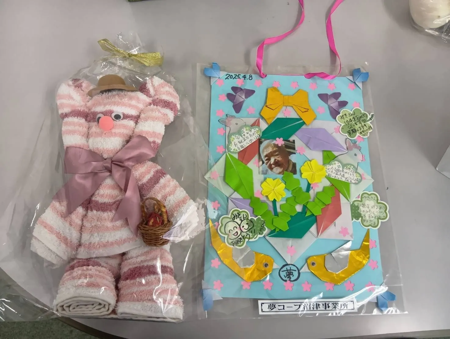 ヘルパーさんの作ってくれたお祝い飾りを手渡しました。