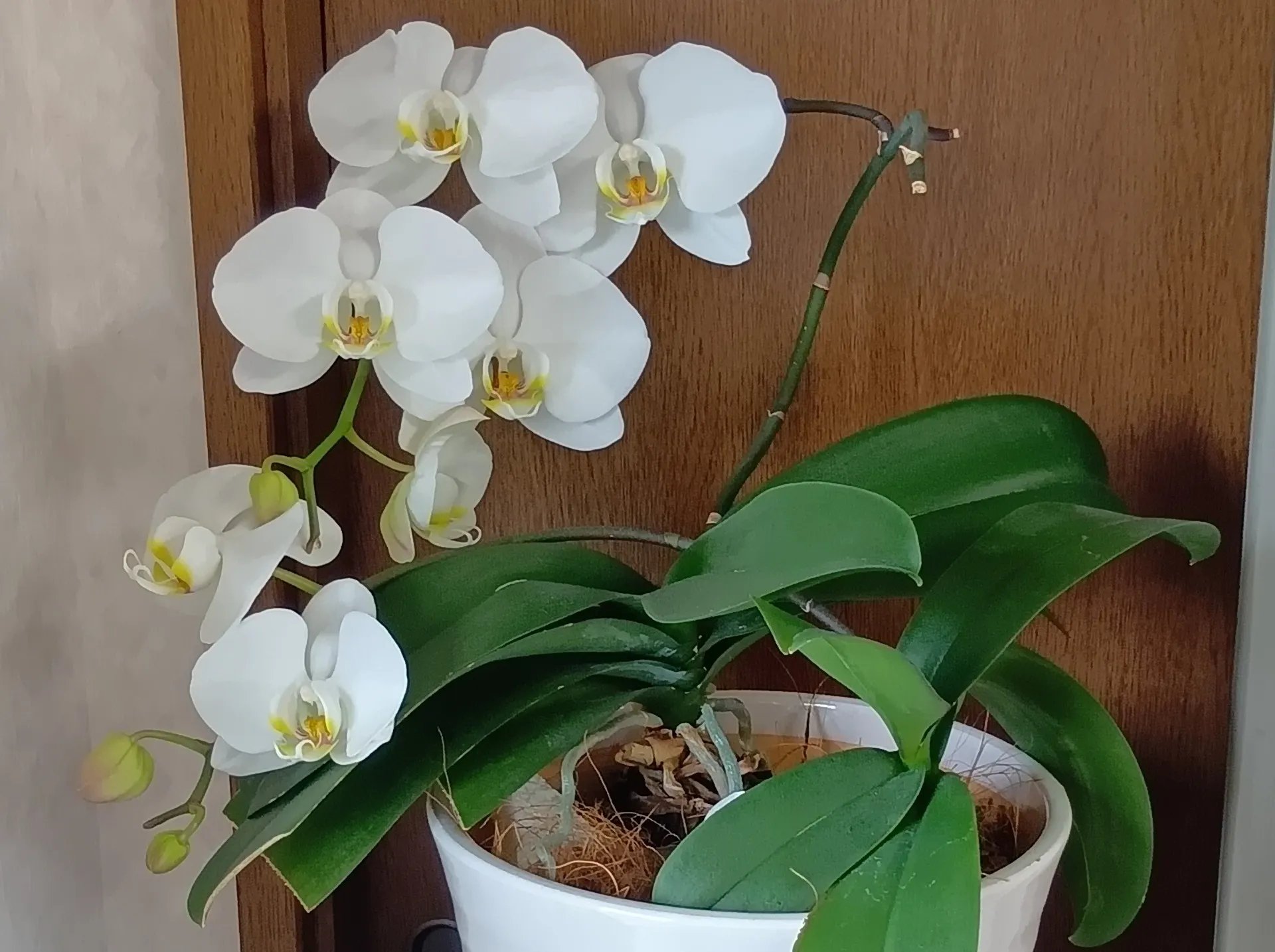 以前いただいた胡蝶蘭の花が今年も咲いたので、入り口に飾りました。