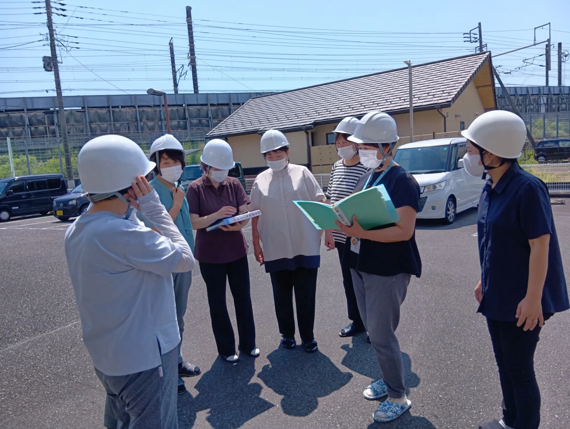 12時のチャイムを合図にヘルメットを着けて外に避難。