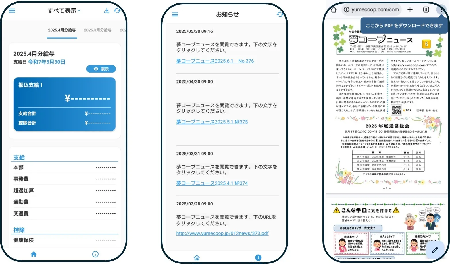 本部 ~給与明細書の電子化~ 「給与明細書」がスマホ配信になり早10か月。「夢コープニュース」も同時配信されいつでも簡単に確認する事ができ利用しやすくなったと嬉しい声が聞こえてきます。本部での配信作業もスムーズに出来るよ…
